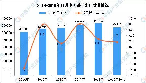 據(jù)中商產(chǎn)業(yè)研究院數(shù)據(jù)庫顯示,2019年1-11月中國茶葉出口量為334128噸,同比增長1.7%;出口金額為1261.78百萬美元,同比增長19.1%。數(shù)據(jù)來源:中商產(chǎn)業(yè)研究院數(shù)據(jù)庫2019年1-11月中國茶